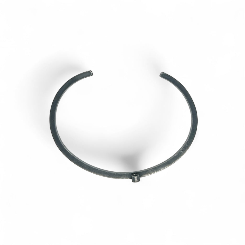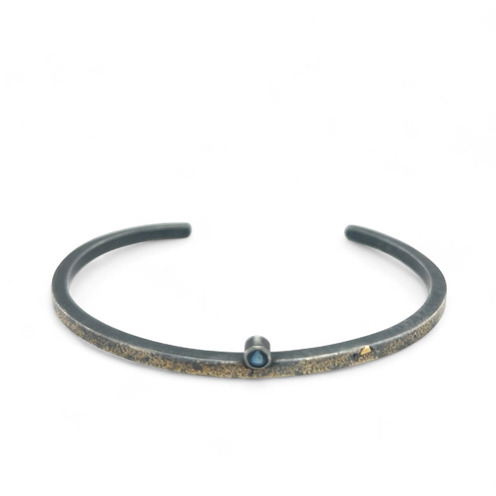 Sterling silver cuff accented with fused 14 and 18 karat gold dust. A 3mm brilliant cut dark blue round sapphire is set in sterling silver asymmetrically on the cuff. Cuff measures 5.25 inches in length with a 1 3/16 inch gap. Please measure your wrist carefully before ordering to ensure a good fit.
