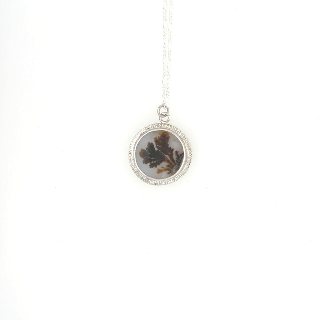 Circular dendritic agate with branch patterns set in fine and sterling silver with hammered details.