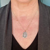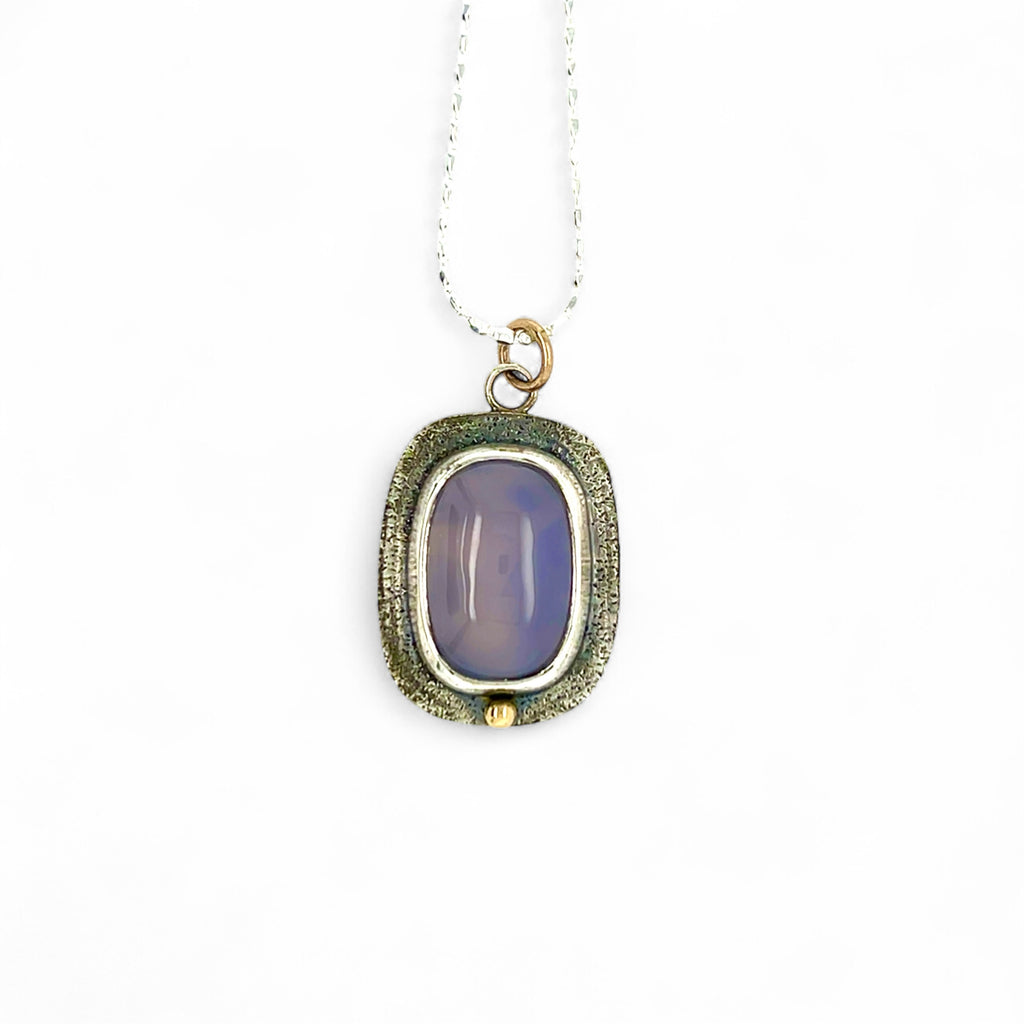 Rectangular lavender chalcedony set in tine and sterling silver with 18 karat gold accents.