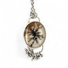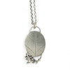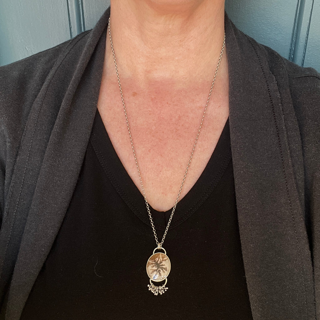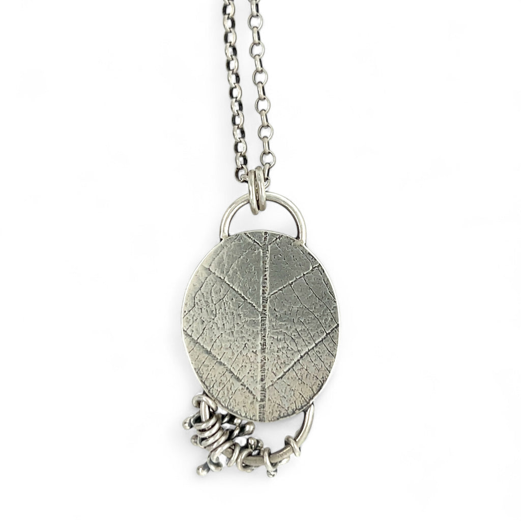 Dendritic agate and quartz doublet set vertically in fine and sterling silver with leaf printed on reverse of the setting and Argentium silver fringe.