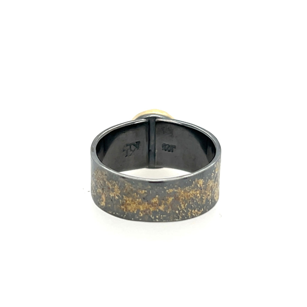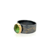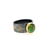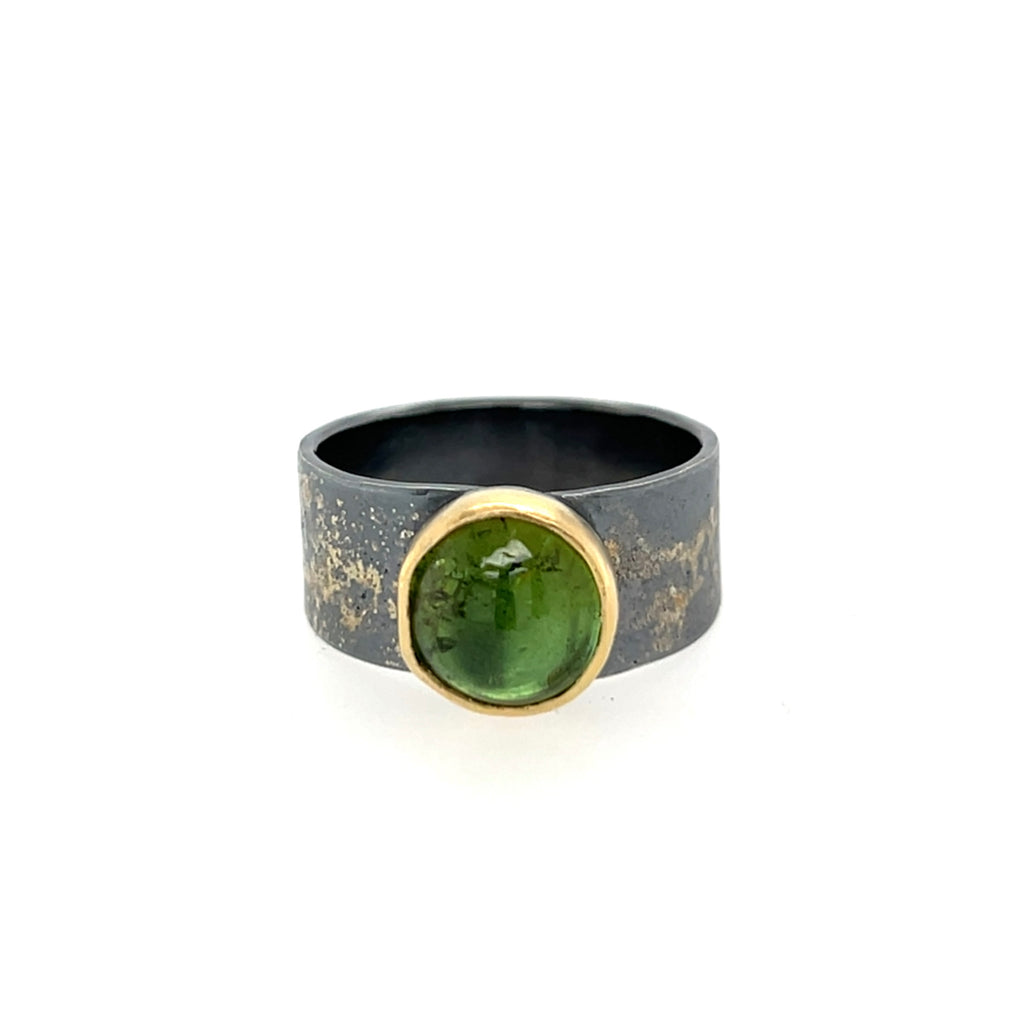 Round green tourmaline set in an 18-karat gold bezel on a sterling silver band patterned with fused recycled 14 and 18 karat gold dust.