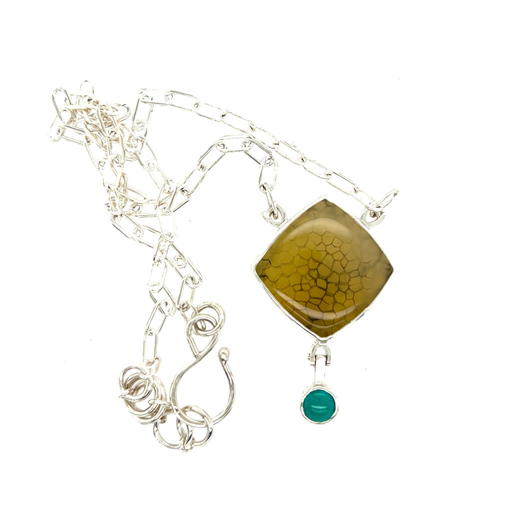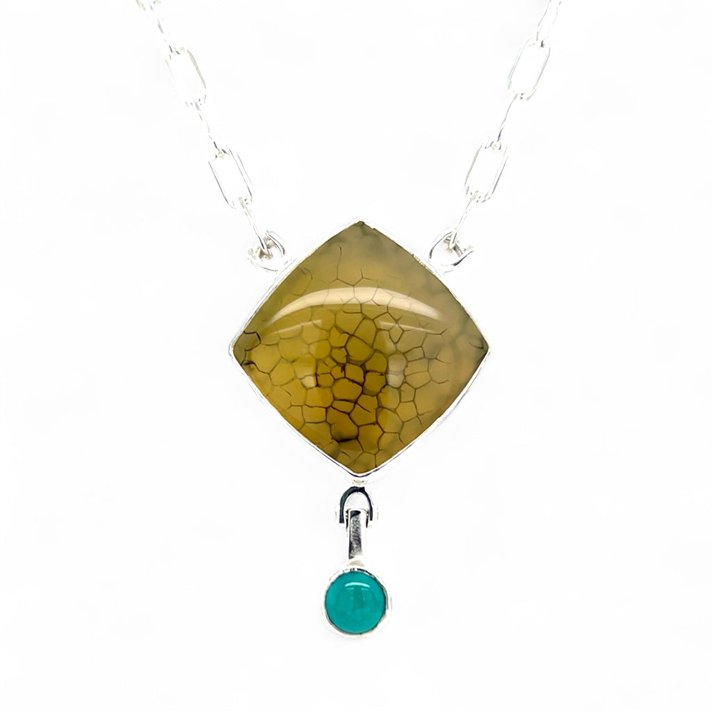 Snakeskin carnelian in an unusual citron color is hinged to a Tyrone turquoise round cabochon in this sterling silver pendant.